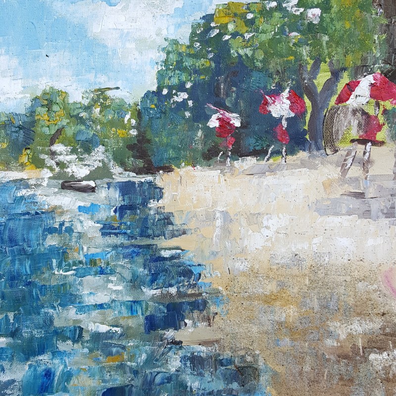 Last month I did a small palette knife landscape of the beach at Arlington Reservoir, which is a popular summer destination for kids and families. I had so much fun talking with the kids who came up to me to ask me about my painting, comment on the colors I was using, and tell me how they thought I could do it better. Then while I was in the process of packing up, some sand got kicked onto the still wet paint, which actually ended up adding a really cool texture and color and the perfect amount of messiness to the finished piece.
