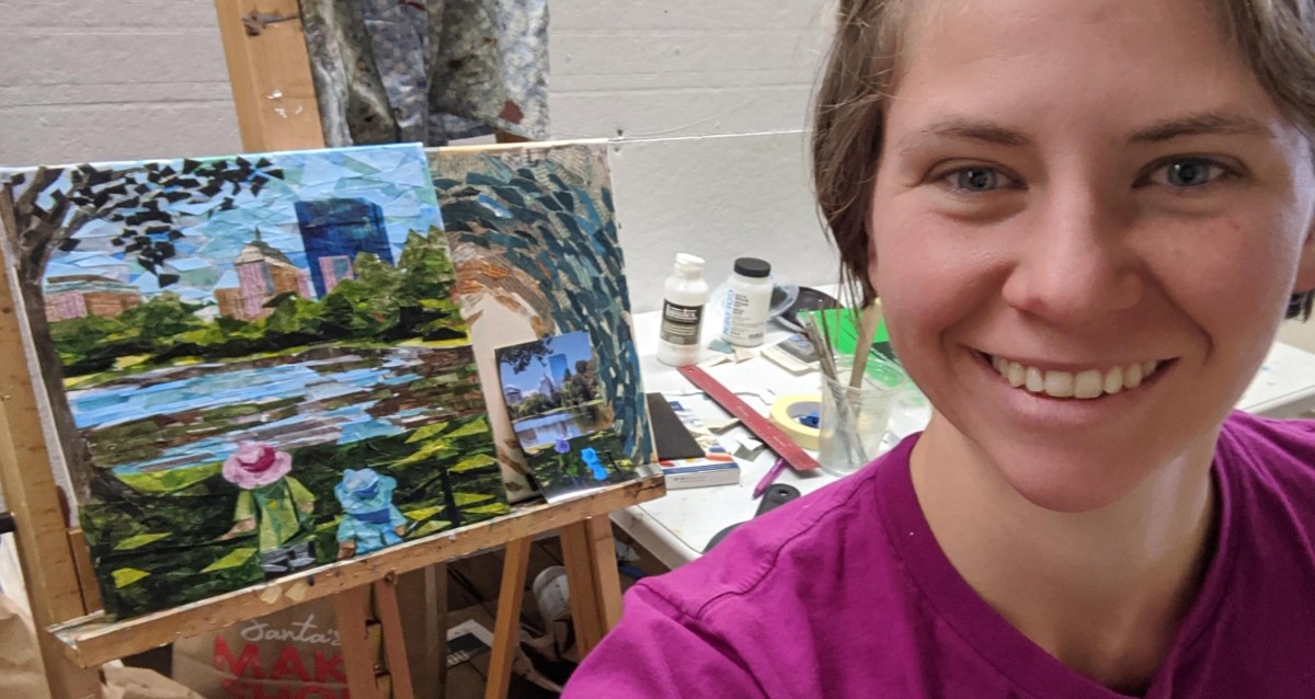 Feeling triumphant! I was able to incorporate a number of things I had learned in other paintings and also take some risks, but in a way that felt really satisfying. Some things that worked: Making choices about my paper texture (cutting with scissors rather than tearing) and size and shape and keeping those consistent. Choosing a color palette in which I am very strong–mostly blues! Keeping it small–this canvas is only 12 inches by 12 inches. I think it also helped that I have already done a few different paintings of the buildings in the background, so I didn’t have to kind of learn new material there. Also it helped incredibly to not have to try to convey faces in a non-distracting way with paper–just doing the back of their heads was a good choice.